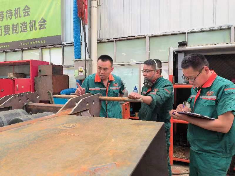 6月17日,陈厂长带领质检部长李子贤巡视生产车间,在焊接、装配、液压、电控等方面分别指出操作细节及要求,并制作最新生产标准。